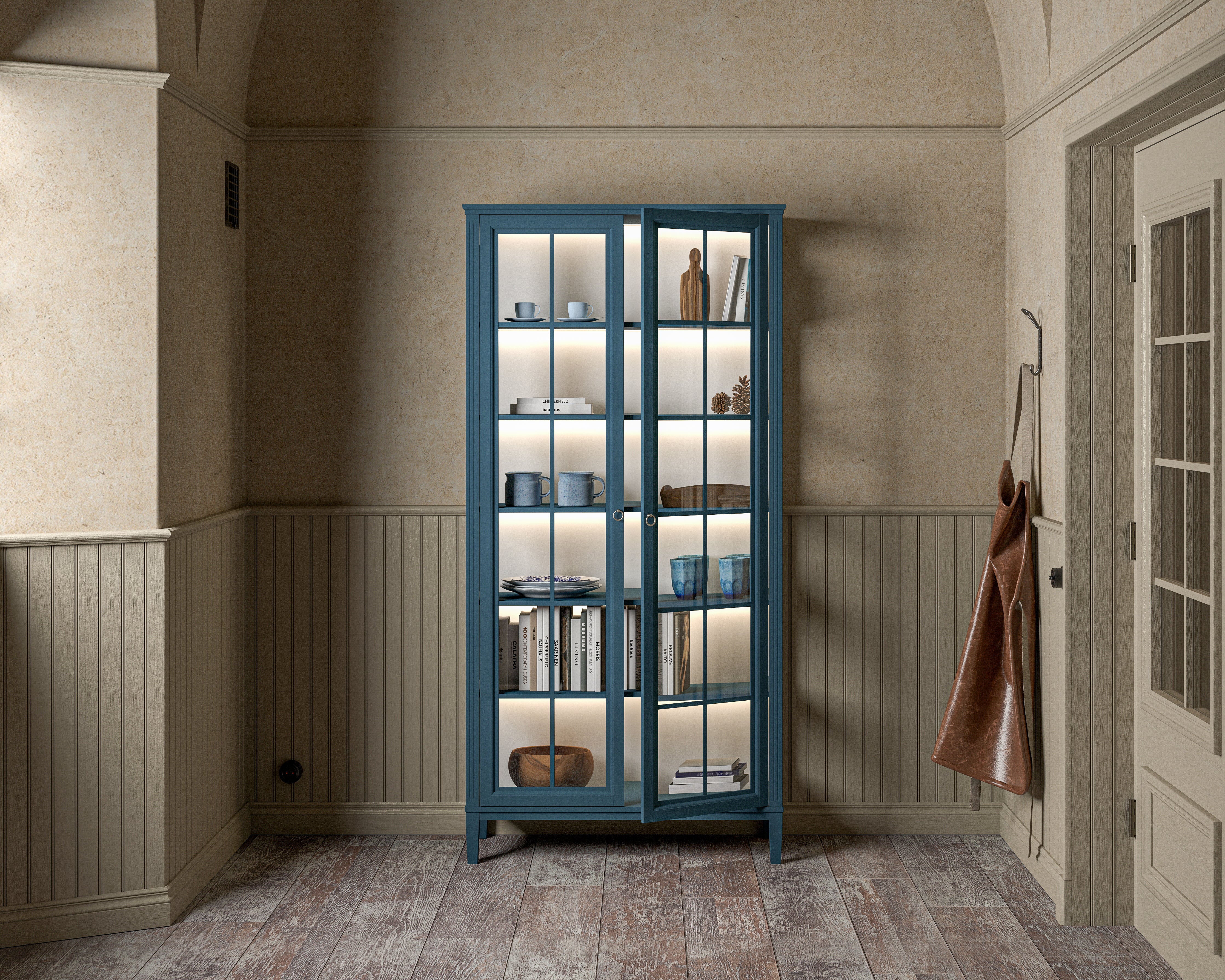 Där klassiska designelement möter modern estetik. Vitrinskåpen med detaljer av Burned Walnut samt integrerad belysning ger en varm och inbjudande känsla. Antika bronsbeslag i modern tappning knyter an till Englessons tradition av kvalitet och stil.