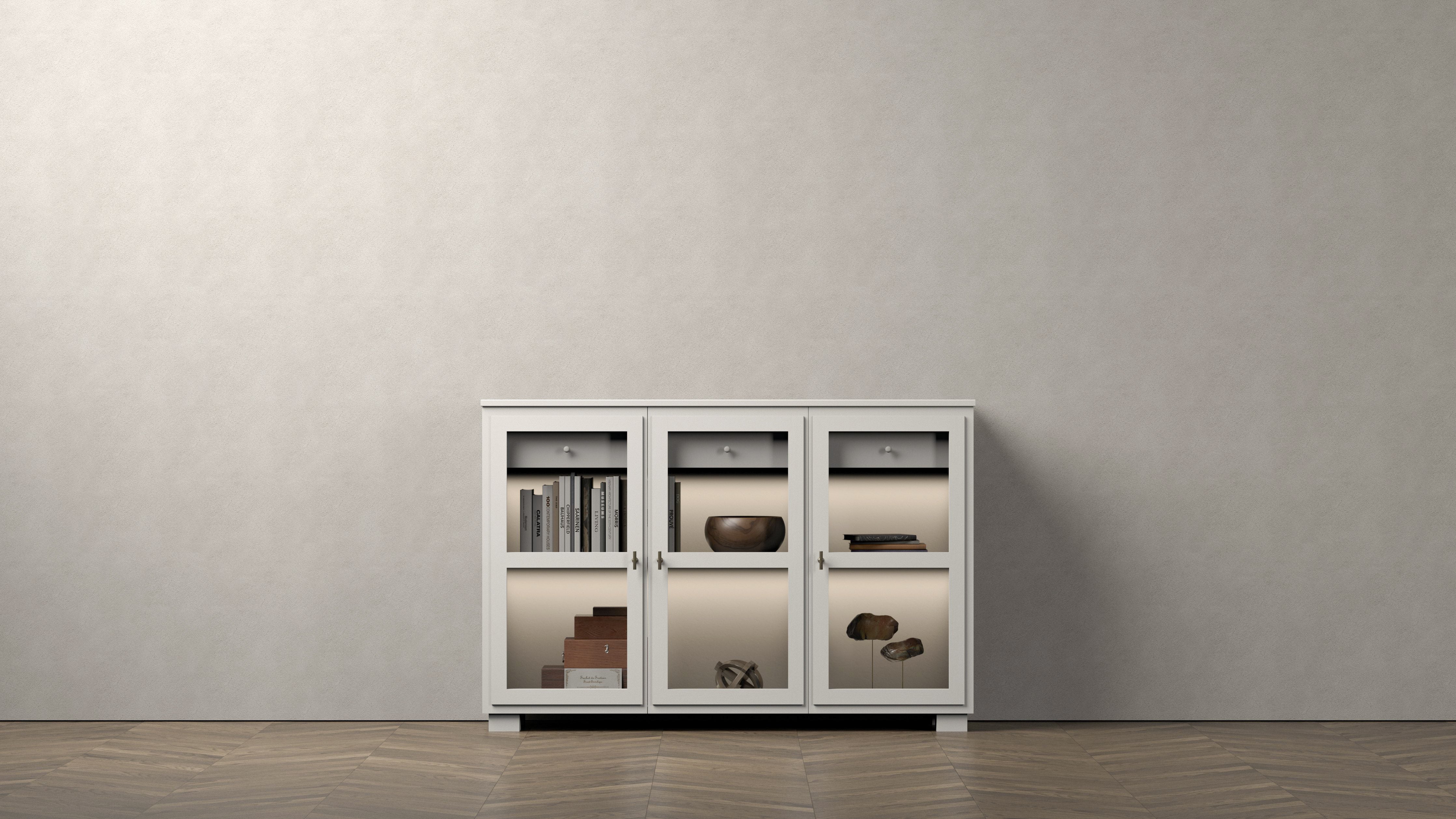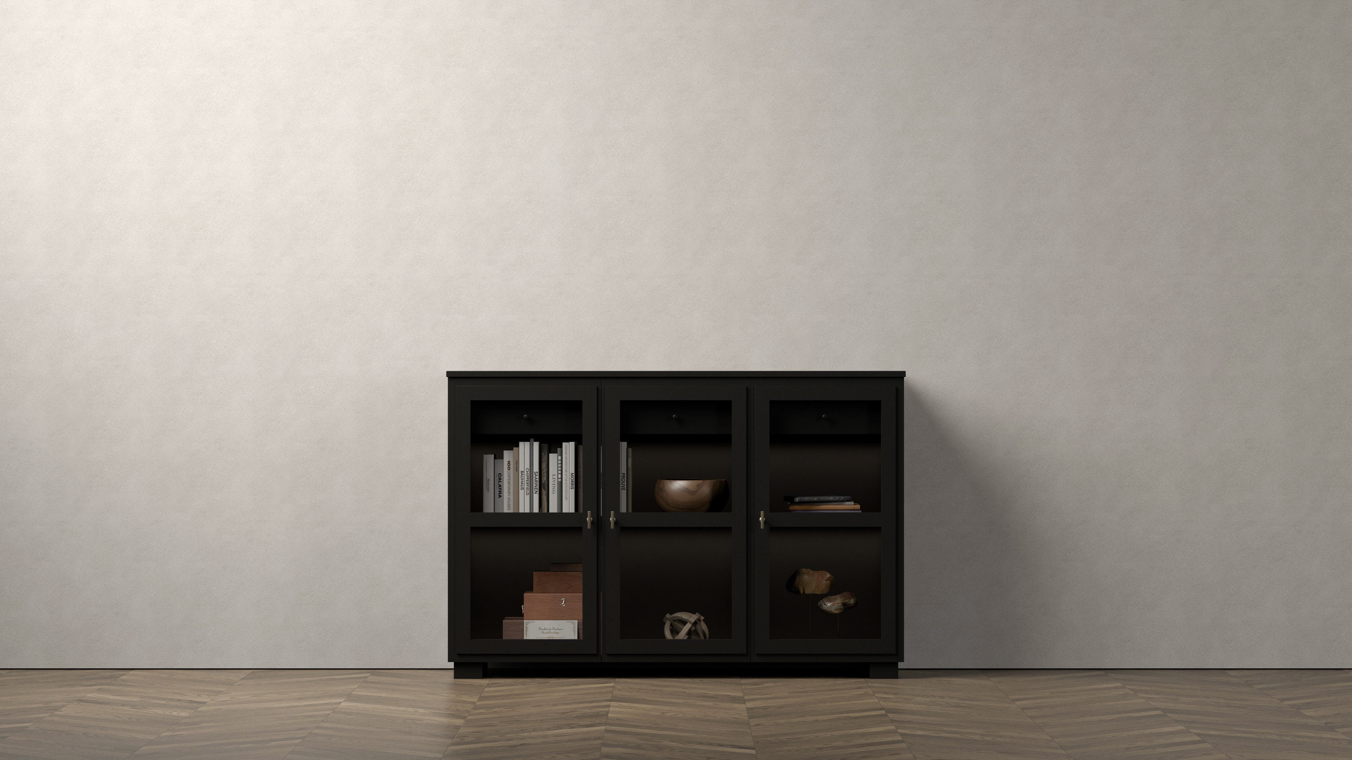 Camden Hög Skänk med tre glasdörrar och två lådor kombinerar stilren design med funktionalitet. Hela möbeln är handmålad med en subtil struktur som ger ett inarbetat och karaktärsfullt uttryck. Glasdörrarna ger ett elegant sätt att visa upp dina föremål, medan de två rymliga lådorna erbjuder smart förvaring. Den integrerade dimbara belysningen skapar en varm atmosfär och framhäver möbelns detaljer. Denna skänk fungerar lika bra som en fristående möbel som i kombination med andra delar i Camden-serien. Finns i färgerna White och Black.