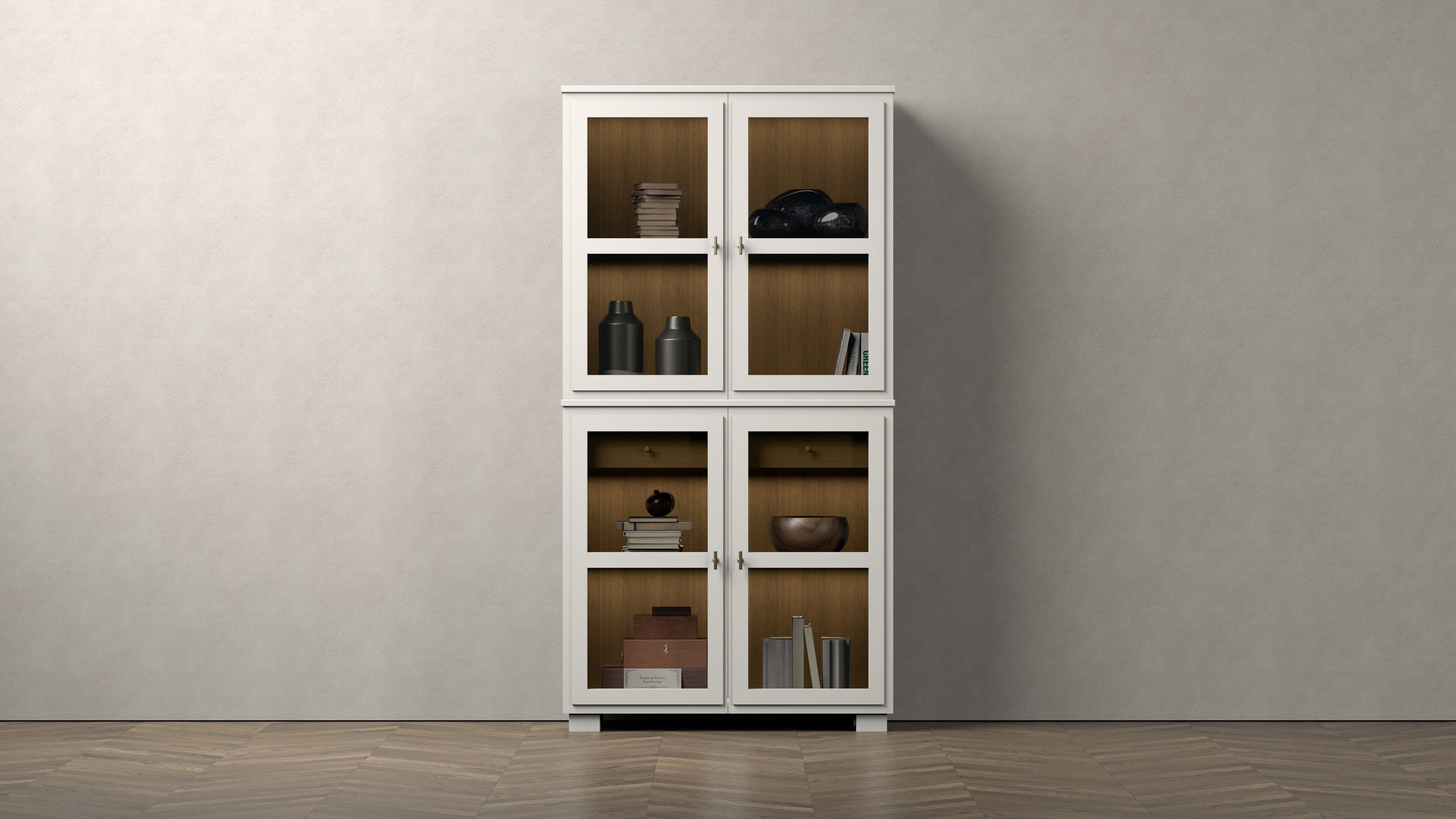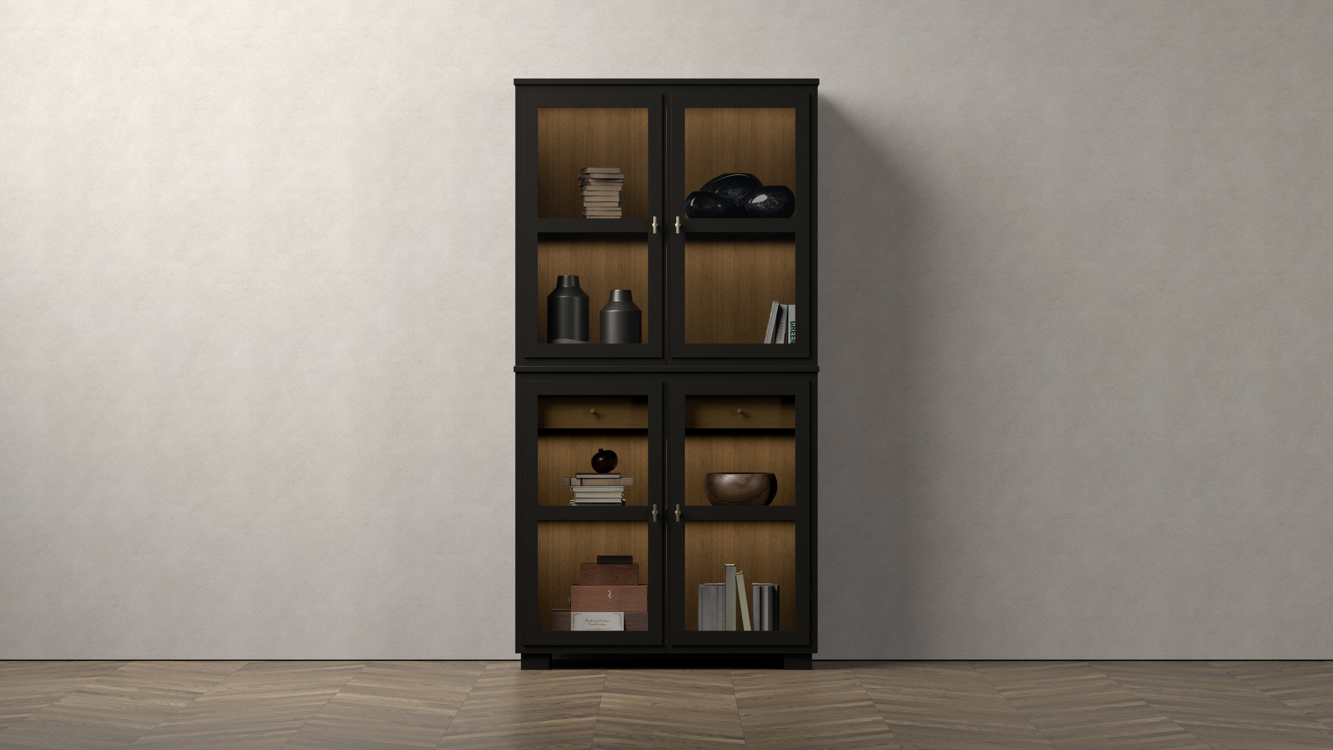 Camden Vitrinskåp kombinerar stil och funktionalitet med sin eleganta design. Den består av en bas med glasdörrar, en hylla och en praktisk låda, vilket ger en perfekt kombination av förvaring och visning. Ovanpå finns en del med glasdörrar och en hylla, båda med ett bakstycke i betsad ek, samt inbyggd belysning som framhäver dina favoritföremål och skapar en inbjudande atmosfär. Hela möbeln är handmålad med en strukturerad finish och finns i färgerna White och Black. Perfekt för att skapa en stilren och enhetlig inredning.