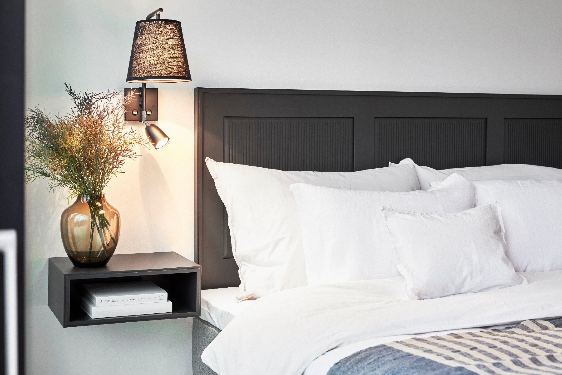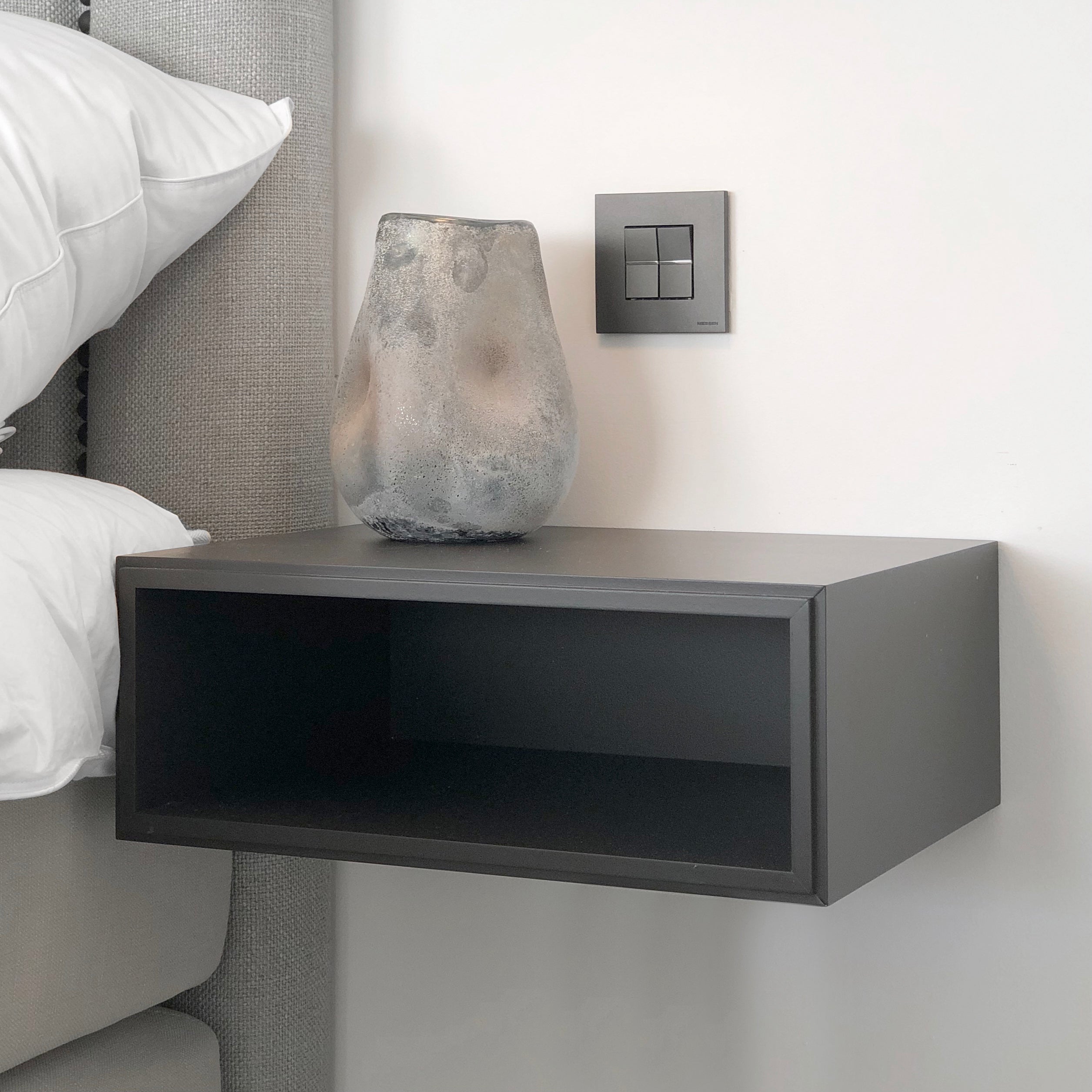 Ett sängbord med en öppen hylla från serien Edge 2.0. Serien är handmålad med struktur och finns i färgalternativen White, Grey och Black. Välj om du vill vägghänga ditt sängbord eller ha det med målade ben, som går att välja i samma nyans eller den kontrasterande oljan Burned Walnut.