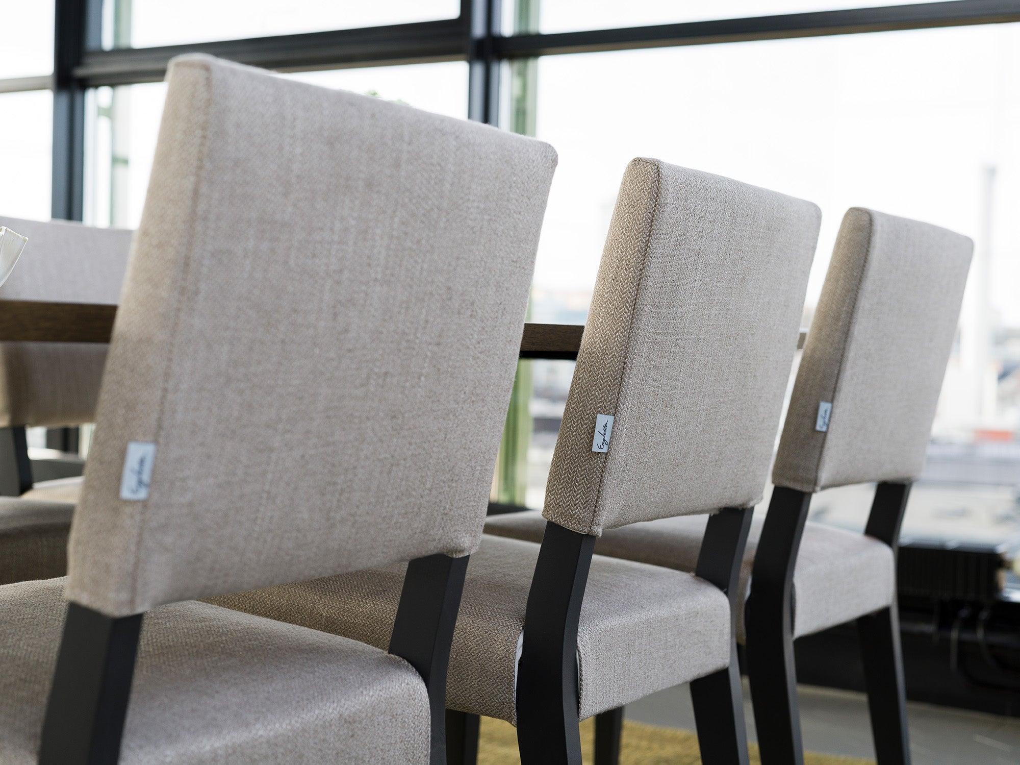 Edge-seriens stol med delad rygg ger både ett luftigt intryck och en stol som är enkelt att flytta. Stolens ben är målade i samma kulörer som Edge 2.0 borden och sitsen har en mängd tyger du kan välja bland fritt.