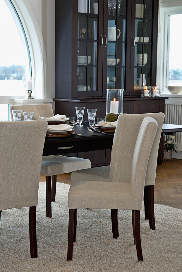 Vår Hamptonstol är en helklädd stol som alltid kommer med avtagbart tyg. Stolensbenen är målade i samma färg som våra bord i Stockholm samt Stockholm 2.0 serierna. I den här stolen sitter du bekvämt under långa middagar.