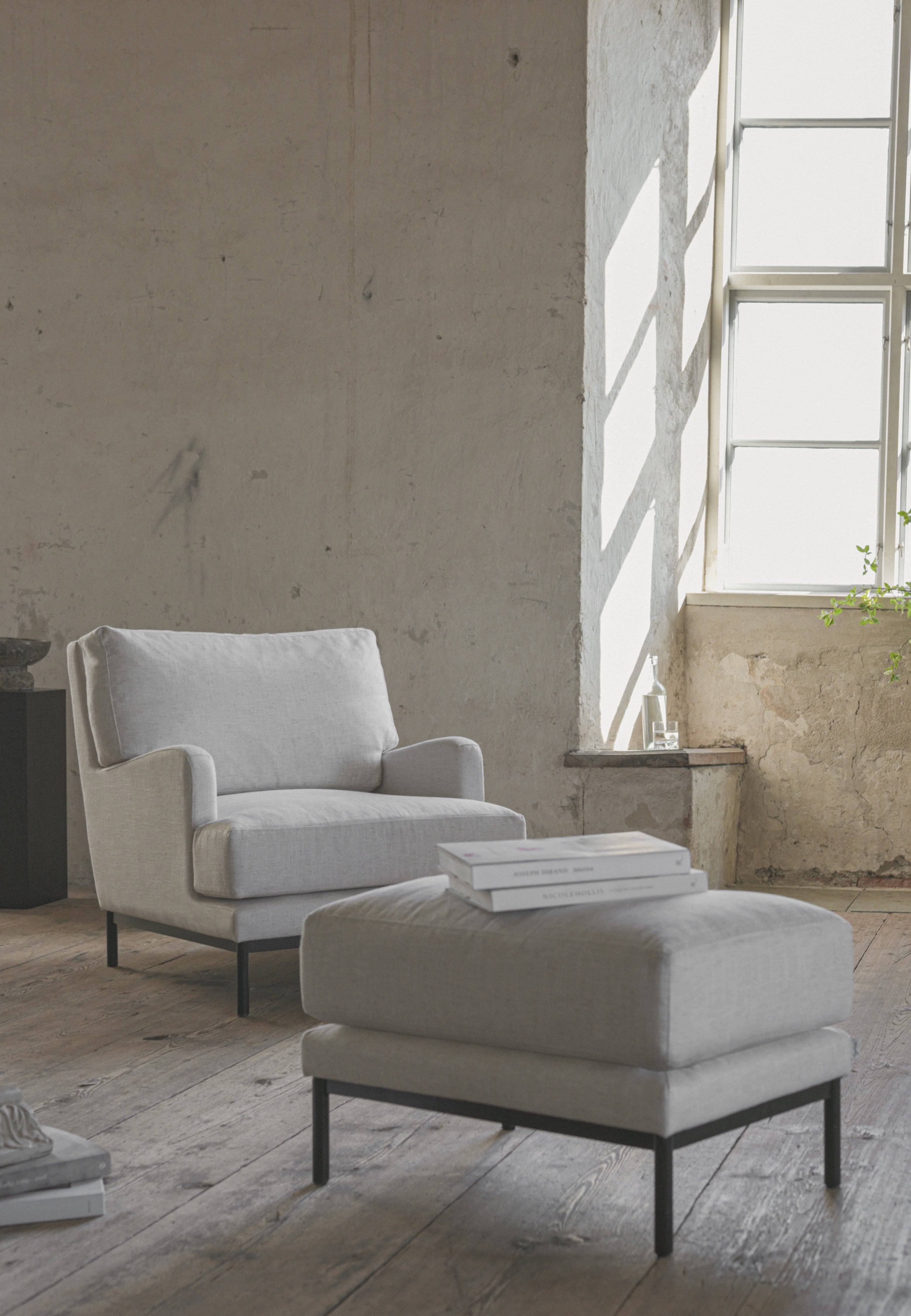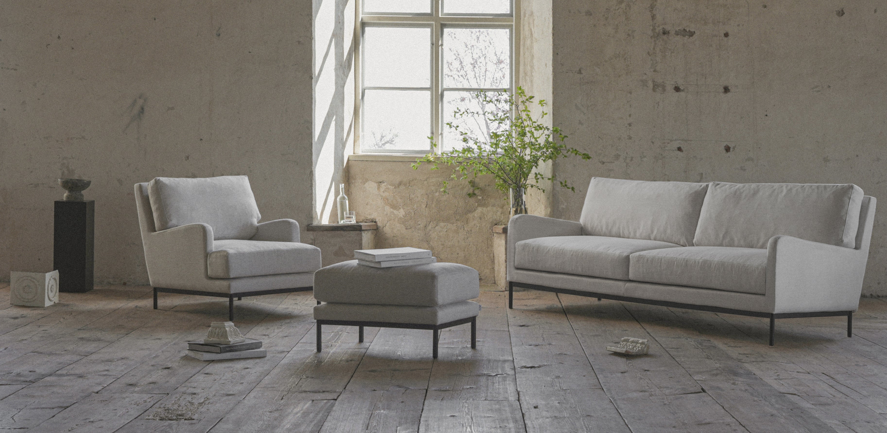 Englessons älskade Howard-serie finns nu i en mer kompakt version. Pallen har en stilren benställning av plattjärn och kompletterar både soffa och fåtölj i Howard Slim-serien.
