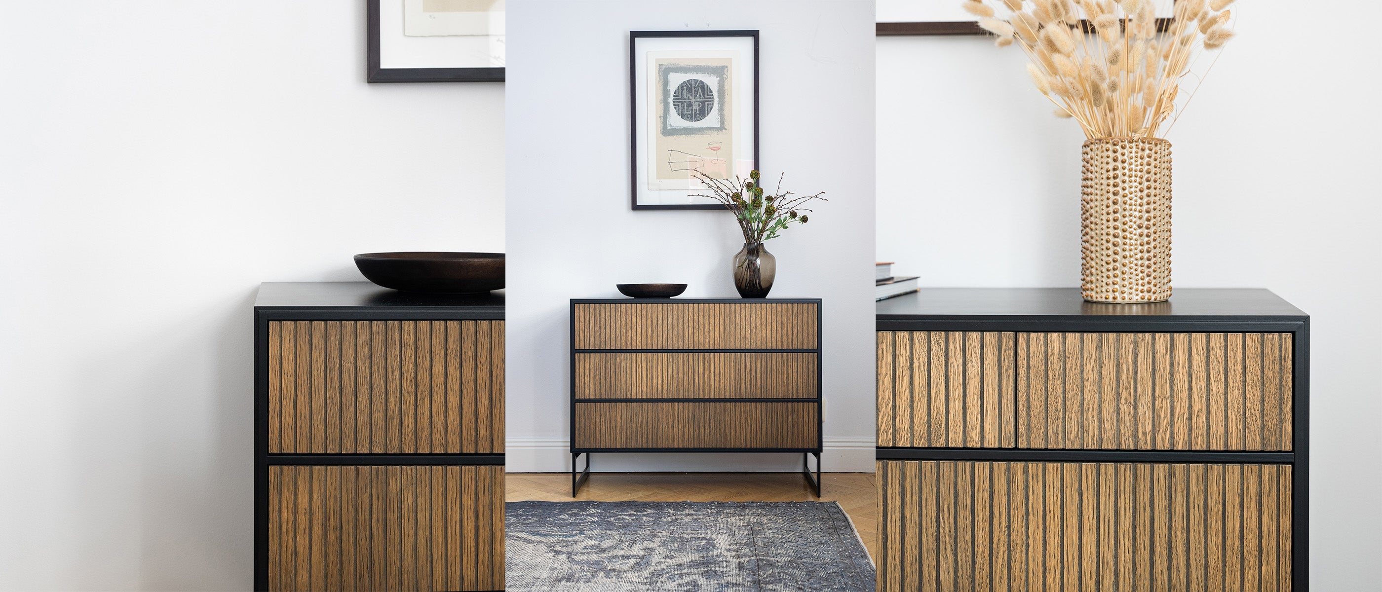 En stilren och modern byrå där lådorna öppnas enkelt genom ett tryck. Serien finns i färgen Burned Walnut med svart eller vit ram.