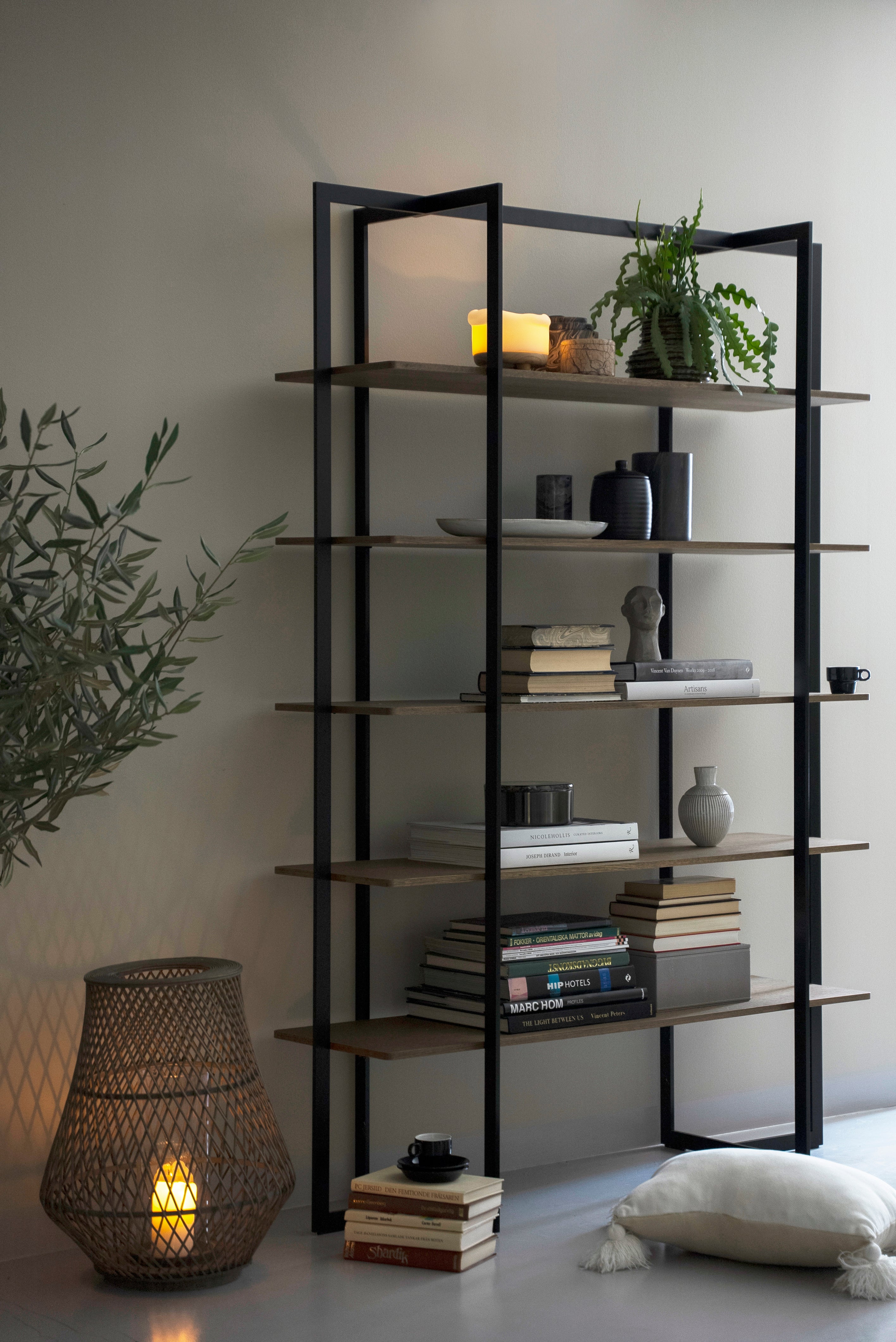Square-seriens egna bokhylla har ett modernt uttryck och blir ett smycke i ditt hem att ställa dina allra finaste saker på. Metallställningen går att gå i svart eller silvergrå färg och hyllplanen kommer i betsen Black Oak eller Burned Walnut.