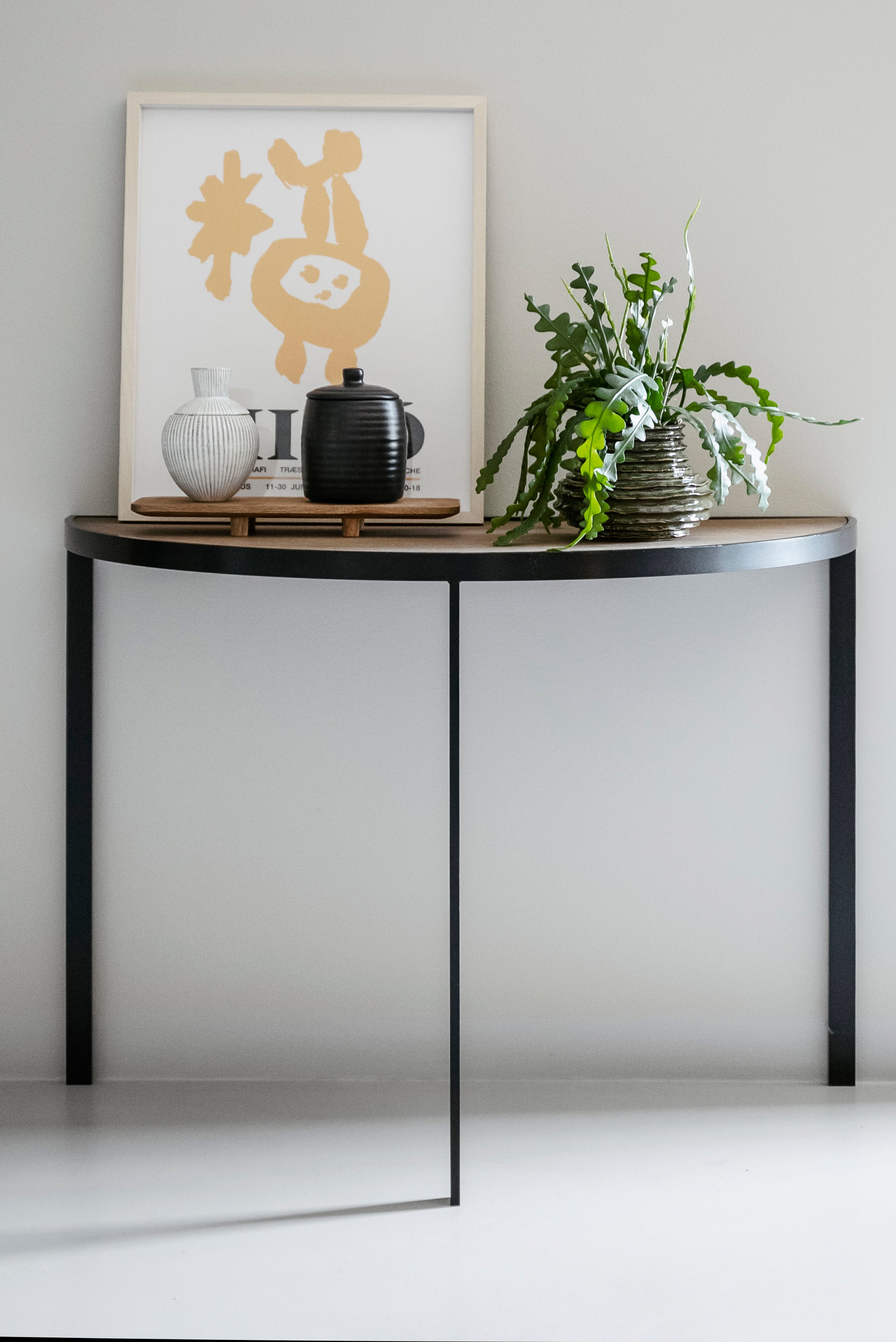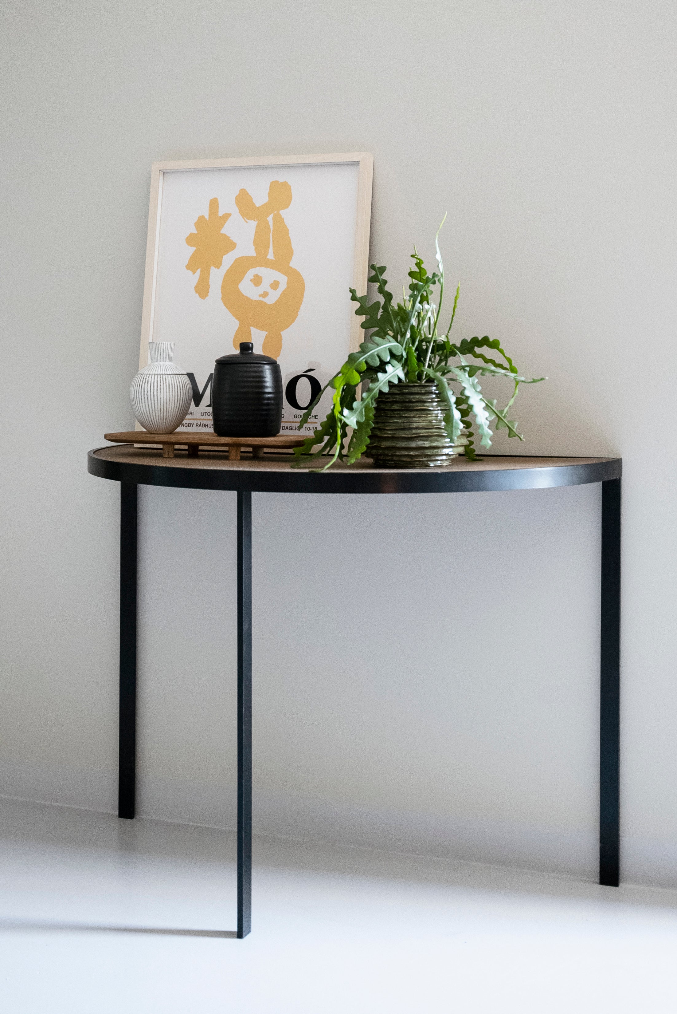 Squares hallbord är ett halvmåne-format bord som med fördel ställs emot en vägg och prydas med en vacker lampa eller förvaring för det du behöver när du är på språng.