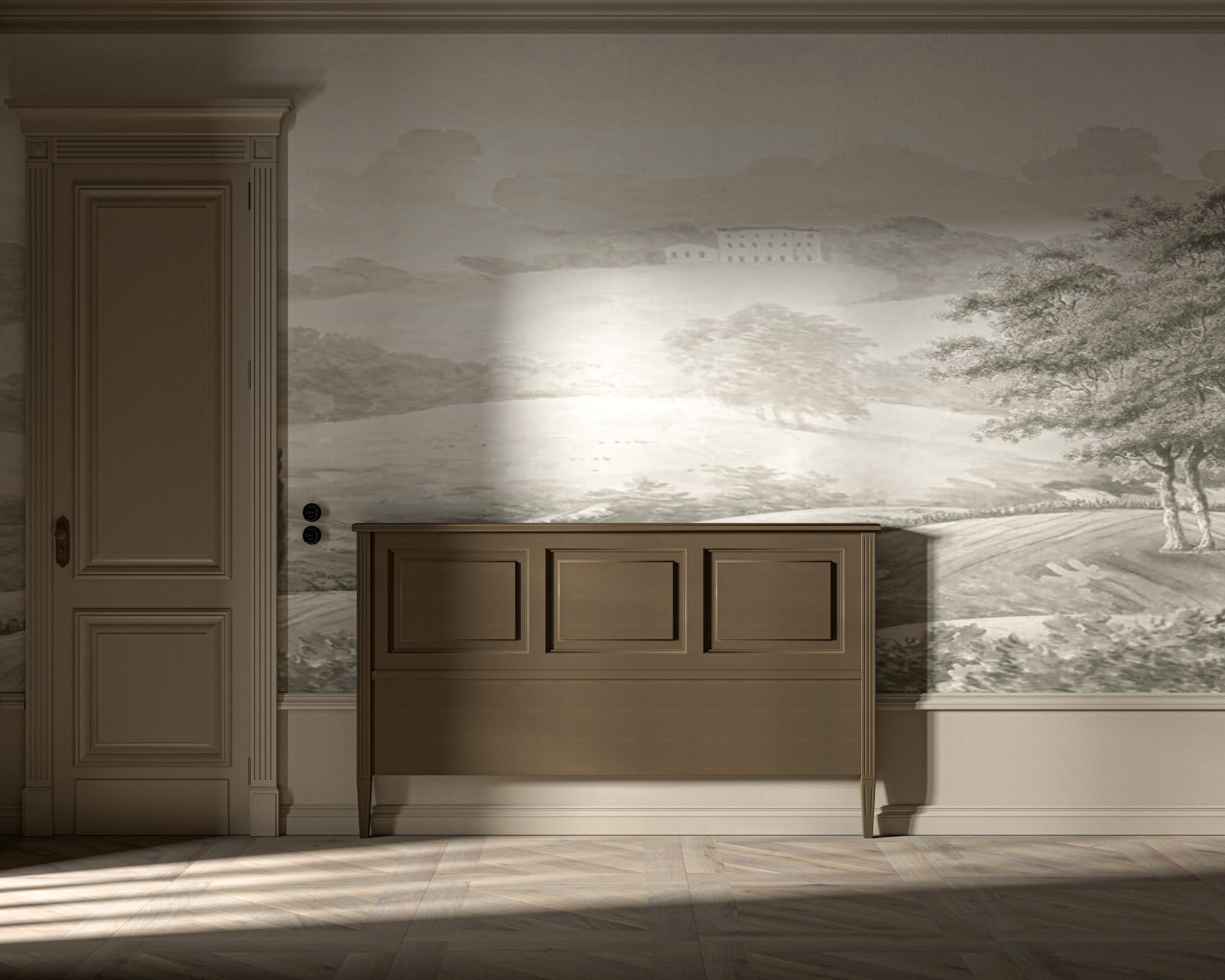 Elegant sänggavel med ben, designad för sängar i bredden 180 cm. Gavlen ger ett modernt och luftigt intryck i sovrummet och kan enkelt placeras bakom en vanlig säng för att skapa en vacker inramning av din sovplats. Finns nu i den tidlösa färgen Mocha.